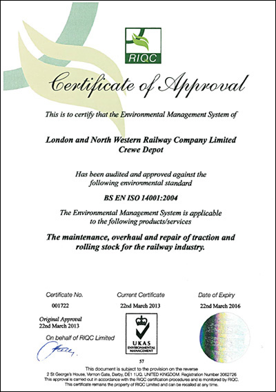 The London and North Western Railway Co. Ltd. are proud to announce that we have achieved certification to BS EN ISO 14001, Environmental Management System Certification for the management of our operational activities.